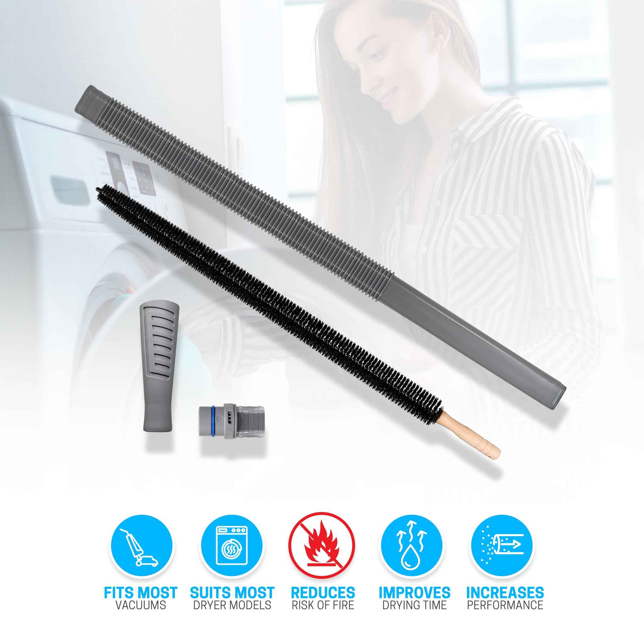 Keep your dryer running safely and efficiently with this all-in-one lint cleaning kit. Featuring a flexible vacuum hose and a durable lint brush, this kit helps deep clean hard-to-reach lint build-up inside your dryer vent and trap.